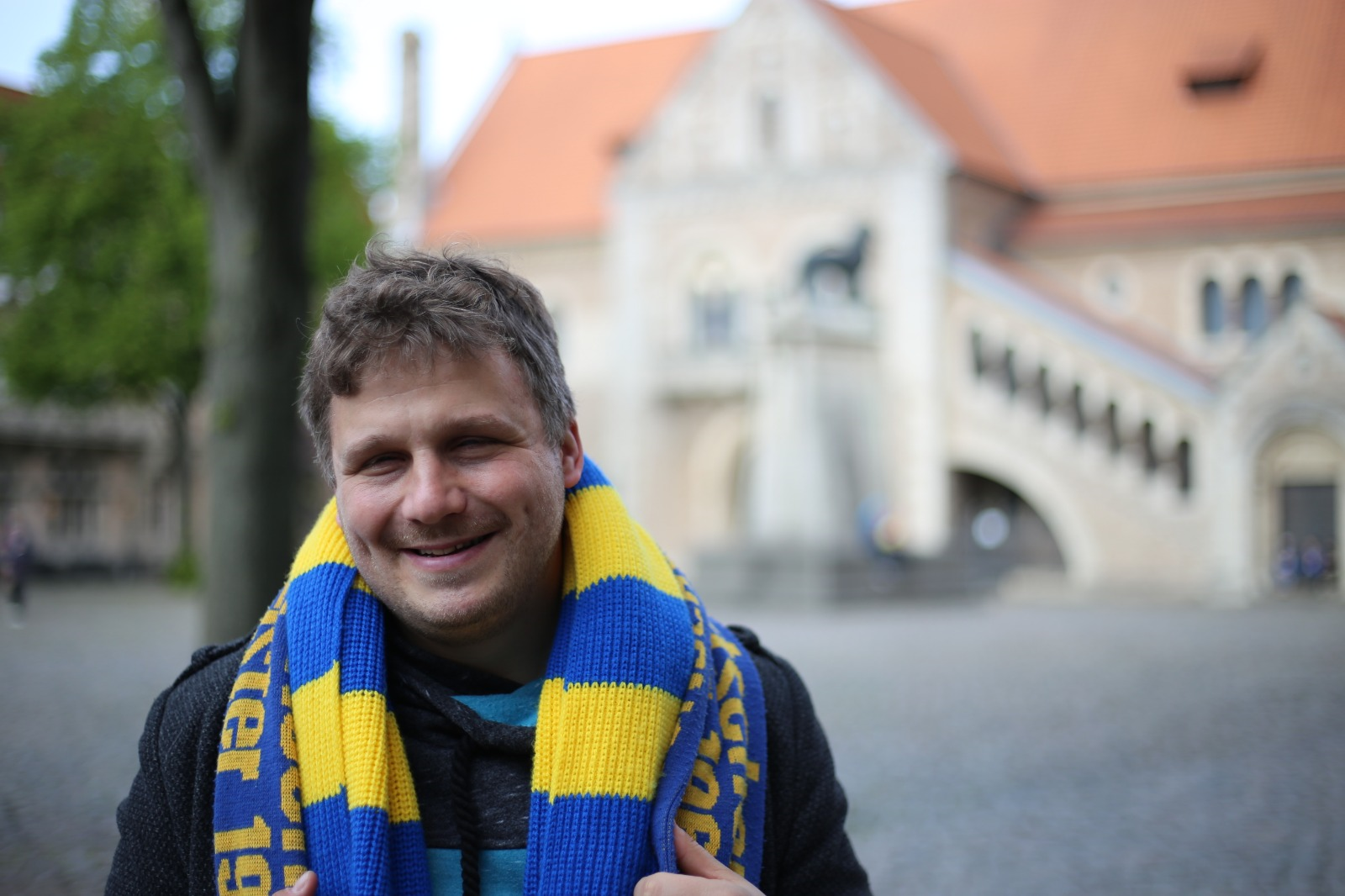Nach dem Essen geht es zum Stadion. Braunschweig spielt heute gegen Münster. In der eng gequetschten Straßenbahn reflektiert er begeistert seine Kindheit, als er noch Fußball spielen und andere Sachen machen konnte. Auch mit maximal zehn Prozent Sehkraft hat Christian damals eine verhältnismäßig normale Kindheit führen können. „Ich habe denselben Scheiß gemacht, den andere Kinder auch gemacht haben“, erzählt er rückblickend. „Der Moment, als das für mich als erstes in Erscheinung getreten ist, war als ich mit elf Jahren meinen Schwerbehindertenausweis bekommen habe. Das war dann quasi eine Kennzeichnung dafür, dass ich da halt was hatte.“ Am Stadion angekommen holt Christian seinen Langstock aus der Tasche. „Bei großen Menschenmassen passe ich lieber auf, wo ich lang gehe“, erklärt er, während er sich mit der Spitze seines Stockes durch das Gewusel der Fußballfans pendelt. „Hallo Herr Draheim!“, begrüßt ihn die Platzanweiserin. Auf den speziell für sehbehinderte Menschen eingerichteten Plätzen angekommen, schildert er, wie es ist, ein Fußballspiel zu erleben. Mit Hilfe von Kopfhörern bekommen Sehbehinderte das Spiel von einem Sehbehindertenreporter bis ins kleinste Detail beschrieben.