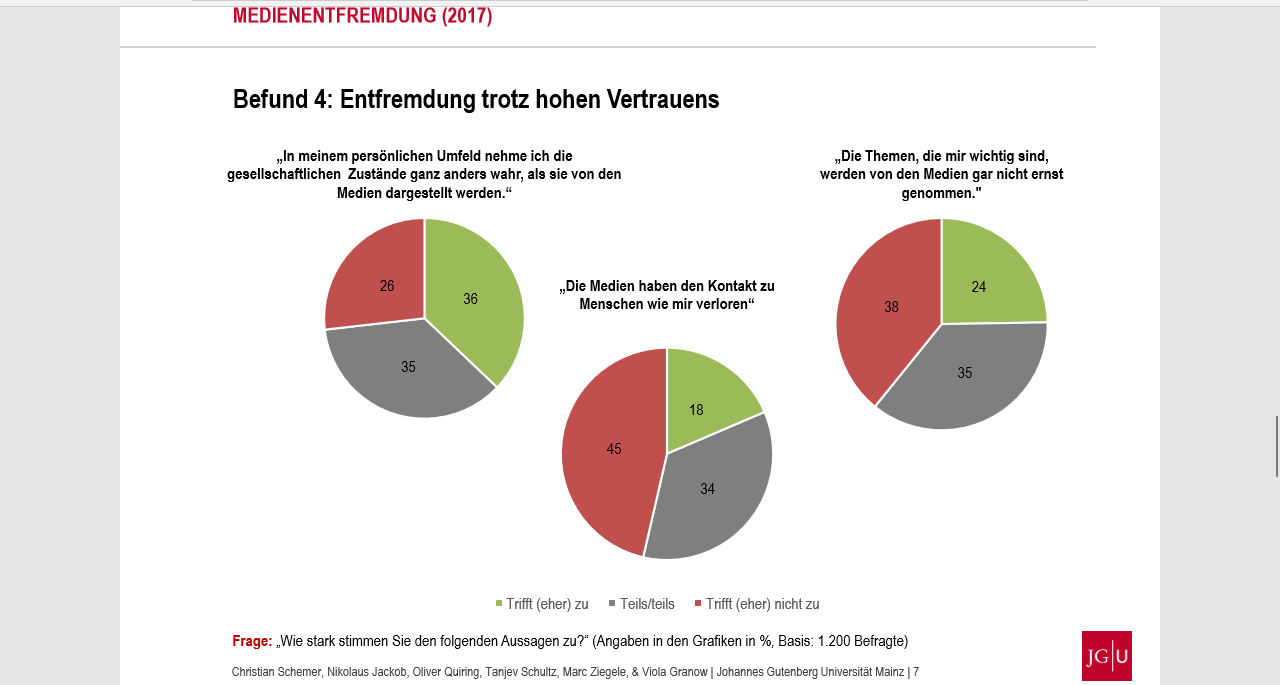 Ein weiterer Grund für das geringe in die Medien, ist die Medienentfremdung. So gaben 36 Prozent in der Studie der Universität Mainz an, dass Medien gesellschaftliche Zustände anders darstellen als sie im eigenen persönlichen Umfeld wahrgenommen werden. 24 Prozent der Befragten stimmten der Aussage zu: „Die Themen, die mir wichtig sind, werden von den Medien gar nicht ernst genommen.“. Ein Grund für die Entfremdung sei, so Schemer, dass viele Menschen nur noch überregionale Nachrichten, wie etwa die Tagesschau konsumieren würden und dadurch keine Meldungen aus der eigenen Region mehr erhalten. Durch dieses Konsumverhalten erhalten die Menschen den Eindruck, dass ihre eigene Lebensrealität in der Berichterstattung gar keine Rolle mehr spiele.