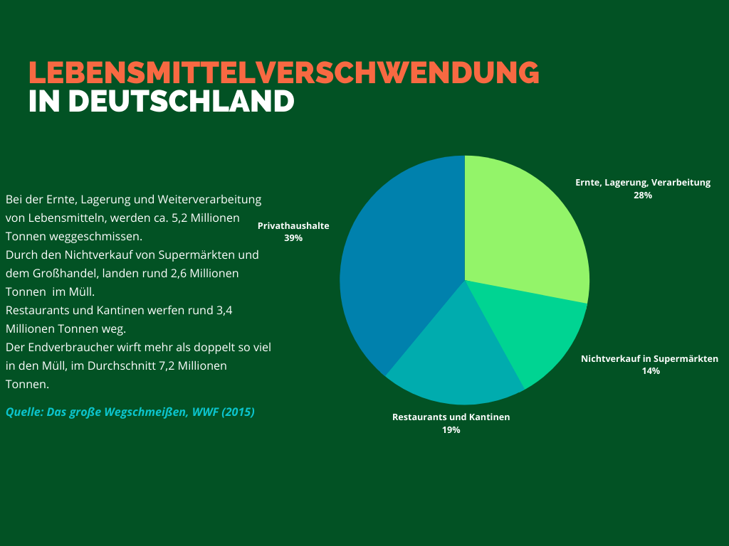 Dies ist jedoch hierzulande Normalität. In Deutschland werden laut einer WWF-Studie jährlich 18 Millionen Tonnen Lebensmittel weggeschmissen. Davon könnten zehn Millionen Tonnen vermieden werden. Hauptverursacher stellen nämlich private Haushalte dar und somit sieben Millionen Tonnen an Nahrungsmitteln.