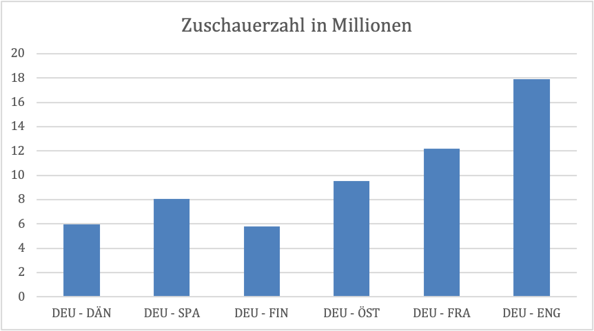 In der Generalprobe vor der EM überzeugte die deutsche Frauenmannschaft mit einem 7:0 Kantersieg gegenüber der Schweiz vor 6.000 ZuschauerInnen. Bei der EM hatte Deutschland mit Dänemark, Spanien und Finnland die stärkste Gruppe des Turniers erwischt. Deutschland als achtfacher Titelträger, Vize-Europameister Dänemark und Spanien waren die Favoriten ums Weiterkommen. Finnland hatte allenfalls Außenseiterchancen. Die DFB-Frauen starteten mit einem furiosen 4:0 Erfolg gegen Dänemark in das Turnier. Im zweiten Gruppenspiel gegen Spanien folgte eine erneute Topleistung der deutschen Frauen. Sie gewannen 2:0, sicherten damit den Gruppensieg und zogen vorzeitig ins Achtelfinale ein. Wie in der Quotentabelle zu sehen, wirkte sich die Leistung auch positiv auf die TV-Quote aus. Das letzte Gruppenspiel gegen Finnland wurde ebenfalls souverän mit 3:0 gewonnen. In einem umkämpften Viertelfinale besiegte die deutsche Mannschaft die NachbarInnen aus Österreich. Ab diesem Zeitpunkt war jedem klar: Deutschland kann Europameister werden. Im Halbfinale warteten die Französinnen. 12 Millionen ZuschauerInnen verfolgten die Begegnung vor den Fernsehgeräten und sahen ein spannendes Spiel, welches die DFB-Frauen mit 2:1 durch einen Doppelpack von Alexandra Popp gewinnen konnten.