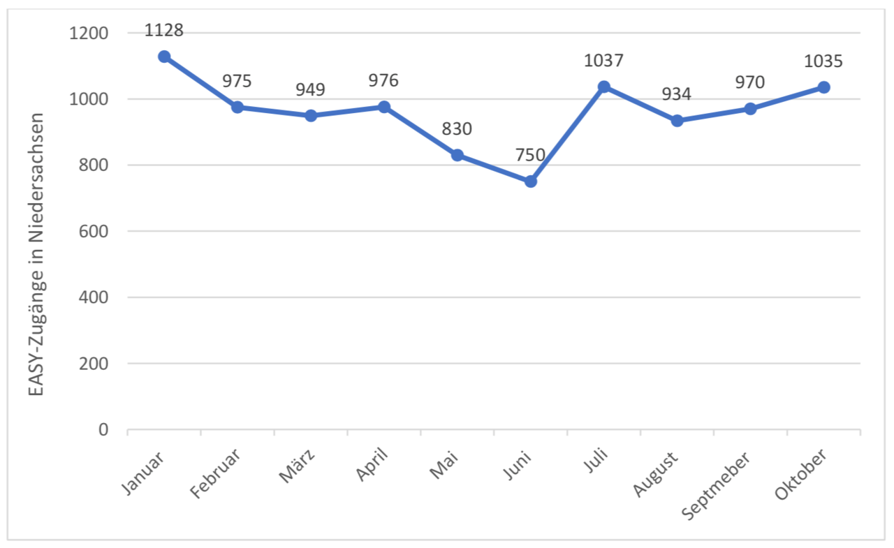 Auch 4 Jahre nach der Flüchtlingskrise in Europa wandern viele Menschen nach Deutschland aus. Anhand des EASY-Systems, einem Computerprogramm des Bundesamts für Migration und Flüchtlinge, werden die Asylsuchenden auf die deutschen Bundesländer verteilt. Dadurch kommen seit Anfang des Jahres folgende Zahlen für Niedersachsen zustande: