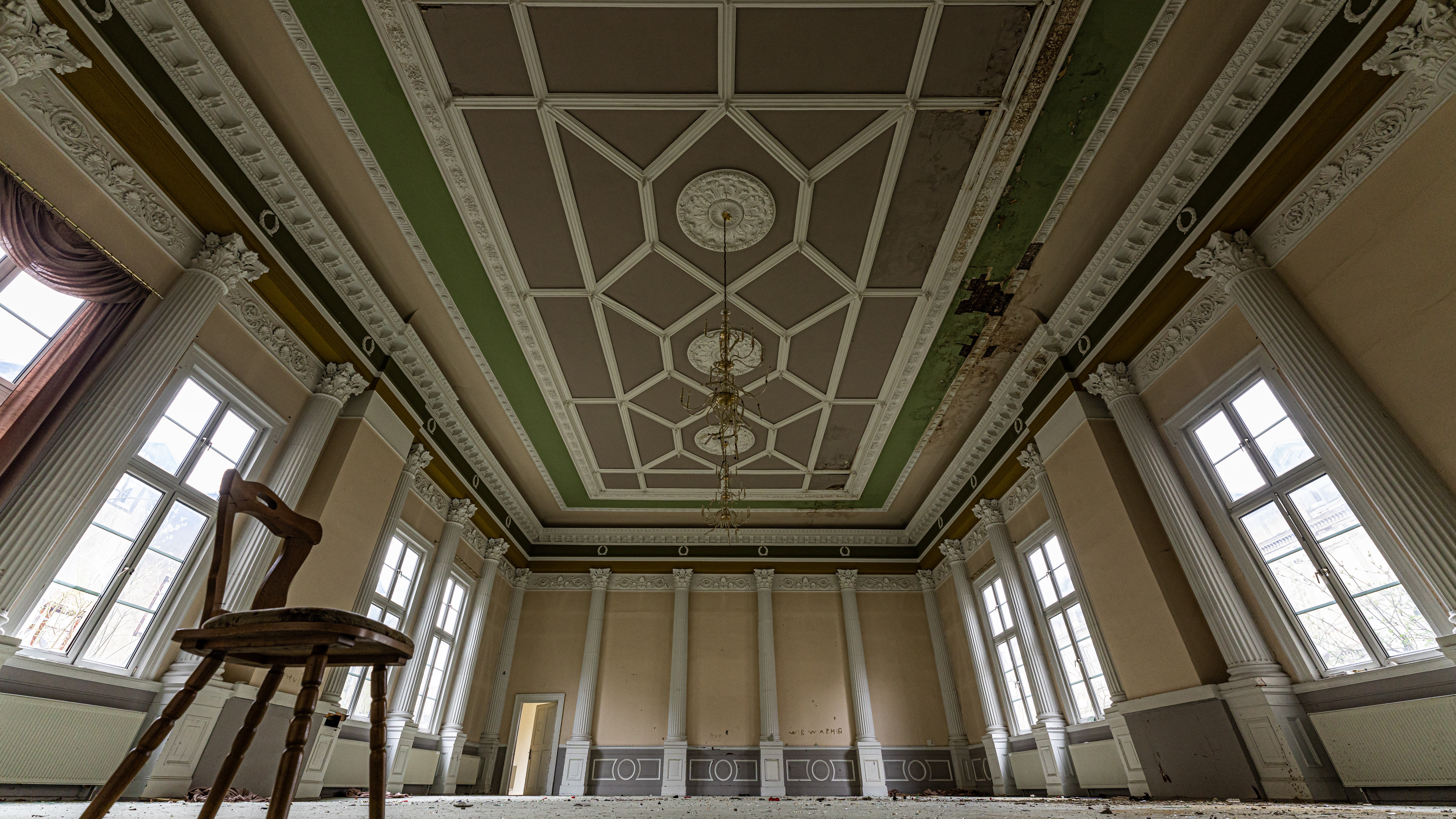 Irgendwo tief im Harz steht ein verlassenes Hotel, in dem einst reges Leben herrschte. Doch mittlerweile wurde es vom ersten Haus am Platz zu einem Geisterhaus. Prunkvoll sieht es aus, fast schon malerisch. Durch die Flügeltür betreten wir den festlichen Saal. Licht strömt durch die großen Fenster an beiden Seiten in den Raum. Mittig ragen drei Kronleuchter herab. Die aufwändig verzierten Säulen stützen die mit Stuck besetzte Decke. Nur eins fehlt: die Gäste.