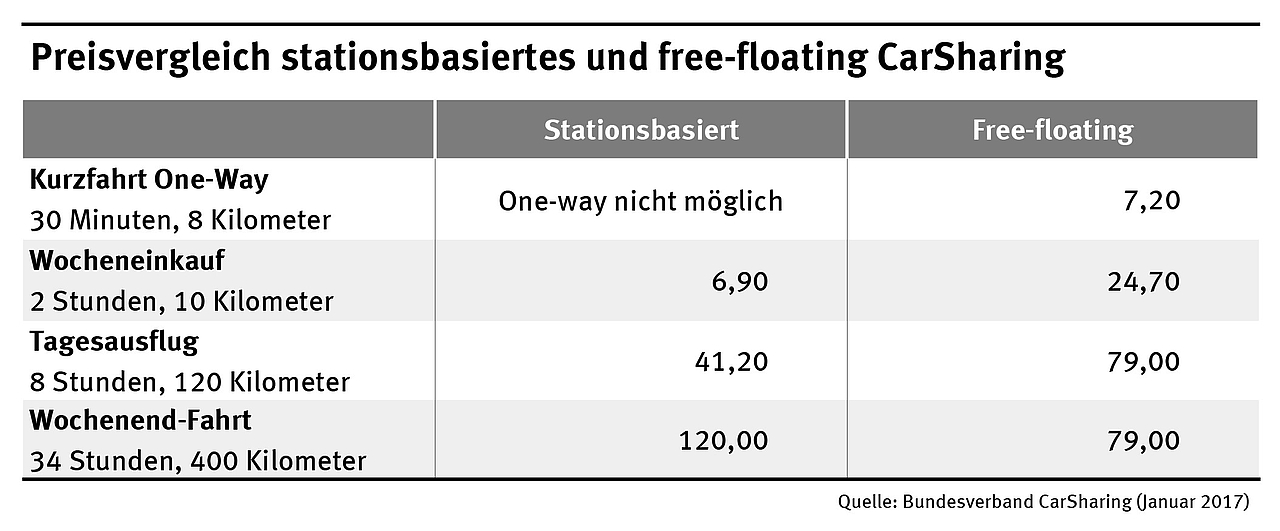 Zu den größten Free-Floating-Anbietern zählen heute Car2go, Eigentum der Daimler-AG, und DriveNow, Angebot des Automobilherstellers BMW. Beide Unternehmen bieten heute mehr als 7.000 Fahrzeuge in sieben deutschen Städten an. 2019 soll es eine Carsharing-Fusion der beiden Mobilitätsdienste geben, um schneller zu wachsen und sich Kosten zu teilen. Vor allem aber wollen sich die beiden Firmen Marktanteile sichern, um der internationalen Konkurrenz standzuhalten. Für Nutzer stehen dann deutlich mehr Fahrzeuge zur Verfügung und es erleichtert das Finden eines freien Fahrzeugs. Neben großen Anbietern wie Car2go und DriveNow gibt es aber auch kleinere Anbieter, die ihr Angebot regional halten.
