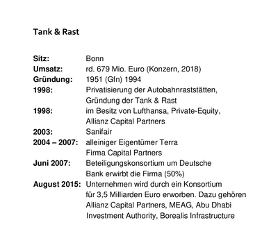 Privat ist Tank & Rast erst seit reichlich 20 Jahren, seit der Bund im Rahmen umfangreicher Privatisierungsmaßnahmen die Nebenbetriebe der Bundesautobahnen verkauft hat. 1998 gingen die Aktien der Gesellschaft vollständig an die ersten Finanzinvestoren über und wurden seitdem schon mehrmals weiterverkauft. Ein nächster Eigentümerwechsel in den kommenden Jahren ist nicht unwahrscheinlich (vgl. Seite 14 Private Equity). Im Zuge der Privatisierung wurden politische Vorgaben an das Unternehmen gestellt. Dabei hieß es in einer Vorgabe, die im Vertrag festgehalten wurde: „Die Tank & Rast wird sich bemühen, die unentgeltliche Benutzung von sanitären Einrichtungen ganzjährig durchgehend sicherzustellen.“ Dass sich Tank & Rast an diese Vertragsklausel nicht gehalten hat, begründet das Unternehmen gegenüber Campus38: „Bereits zum Zeitpunkt der Privatisierung stand außer Zweifel, dass der erhebliche Modernisierungs- und Investitionsbedarf im Sanitärbereich eine dauerhafte unentgeltliche Nutzung der Toilettenanlagen unmöglich machen würde.“ Dabei ist festzuhalten, dass der Tank & Rast die Gebäude gehören, die Auffahrten, Parkplätze und Autobahnen jedoch nach wie vor staatlich sind und damit vom Steuerzahler bezahlt werden. Wieviel Millionen Euro Umsatz und Gewinn Tank & Rast tatsächlich mit Sanifair macht, ist unbekannt. Das Unternehmen möchte sich dazu „aus Wettbewerbsgründen“ nicht äußern. Bei einem geschätzten Einkommen von jährlich circa 60.000 Euro pro Anlage, dem Sanifair auch nicht offen entgegentritt, bei 520 Sanifair-Toiletten und der extrem hohen Profitabilität der Konzerngeschäfte ist kaum vorstellbar, dass das Geschäft mit dem menschlichen Bedürfnis nicht hoch rentabel ist. Rechnerisch ergibt sich dann allein für Sanifair ein Umsatzbeitrag von rund 31 Millionen Euro, den das Unternehmen nicht kommentiert. Rechtlich ist das nicht zu beanstanden. Ende 2013 sind die Bedingungen des Privatisierungsvertrags ausgelaufen – einen Zwang zum Gratisangebot der Toiletten gab es nie, wie Tank & Rast betont. Wer gegen Tank & Rast vorging, zog meist den Kürzeren, wie die Stadt Seesen im Harz, die sich 2011 die Gebührenerhöhung nicht gefallen lassen wollte. Tank & Rast bekam Recht. Anrüchig ist vielmehr, dass es keine sinnvolle Alternative gibt.