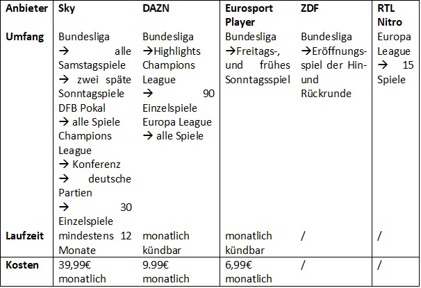 Mit diesen drei Abos sind es ca. 45 Euro, die Fans im Monat aufbringen müssen, um alle Partien mit deutscher Beteiligung zu sehen. Auch wenn viele Fans nicht auf alle drei Pay-TV Anbieter zurückgreifen, ist es mitunter schwer, auf den ersten Blick zu erkennen, welches Spiel wo übertragen wird.