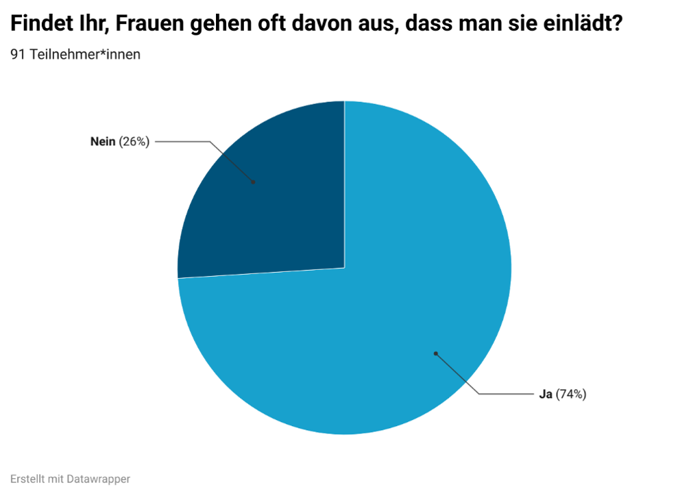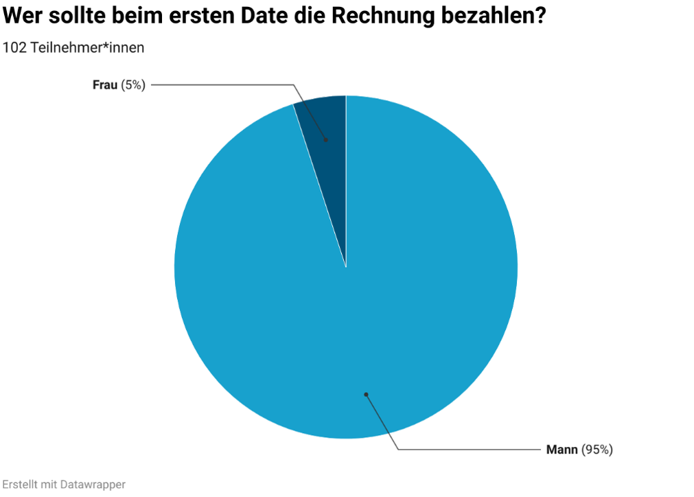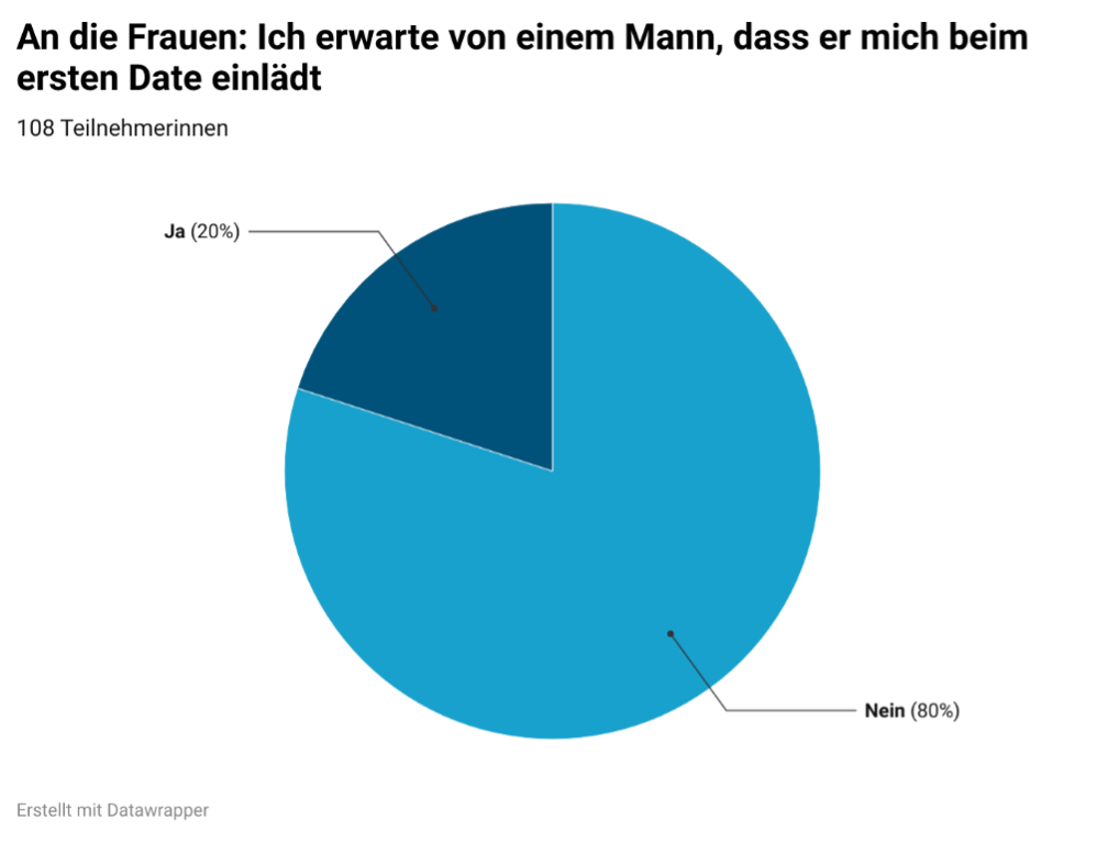 80 Prozent der befragten Frauen erwarten also nicht, von einem Mann eingeladen zu werden, xx Prozent sind aber gleichzeitig der Meinung, der Mann solle die erste Rechnung zahlen. Erwarten Frauen es vielleicht doch und trauen sich nur nicht, es auch wirklich zuzugeben?