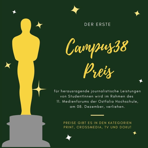 Dieses Jahr wurde im Rahmen des Ostfalia Medienforums am 8. Dezember zum ersten Mal der Campus38-Preis für herausragende journalistische Arbeiten in den Medienstudiengängen verliehen. In den Kategorien Doku, TV, Print und Crossmedia wurden die besten Beiträge des Jahres ausgezeichnet. Hier findet ihr einen ...