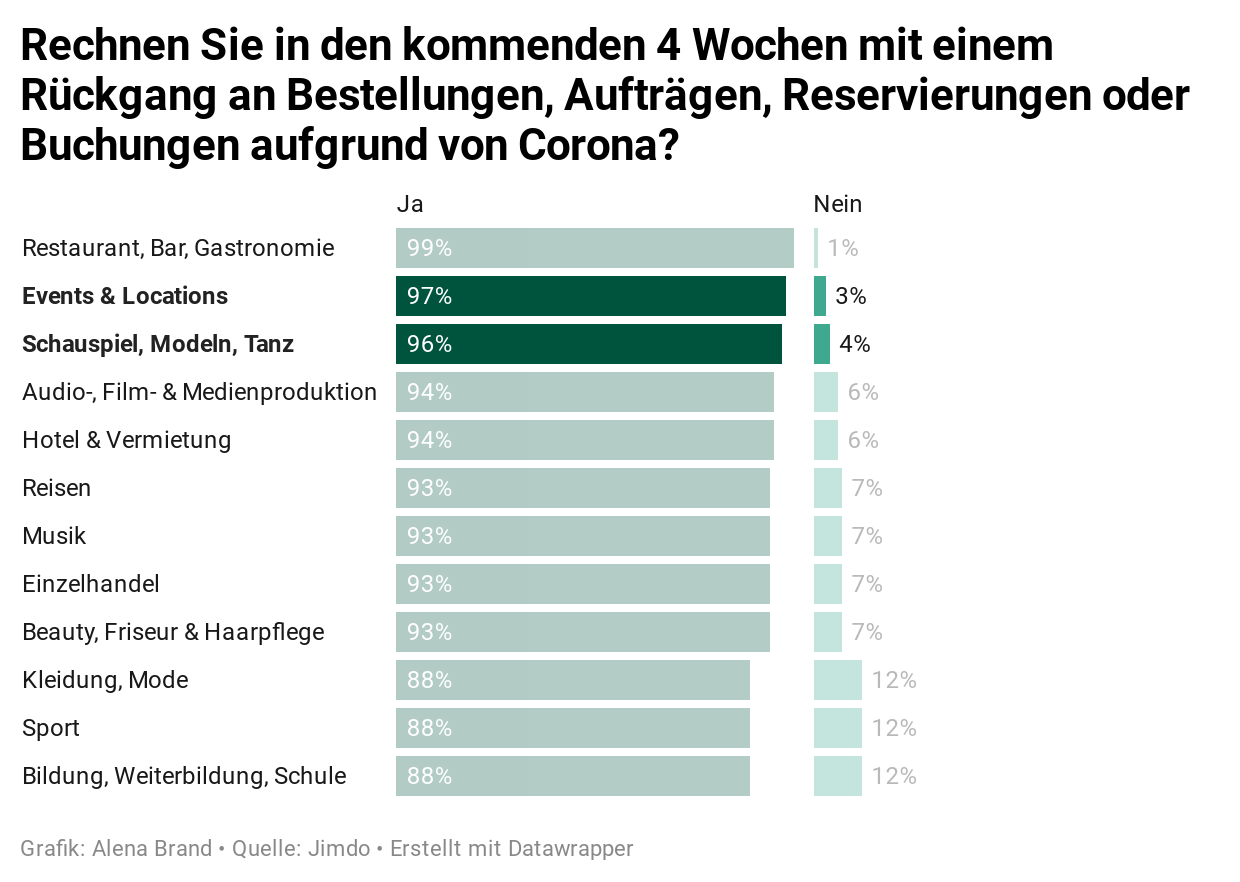 Bei einer im März 2020 durchgeführten Umfrage von Jimdo wurde genau diese Problematik sichtbar. Aus der Kategorie Schauspiel, Modeln, Tanz befürchteten 96 Prozent, dass sie in den kommenden vier Wochen – ausgehend vom Befragungszeitpunkt – mit einem Rückgang an Buchungen oder ähnlichem rechnen. In der Kategorie Events und Locations waren es sogar 97 Prozent. Jimdo ist ein Unternehmen, das Selbstständigen beim Aufbau einer Webseite hilft. Die Selbstständigen wurden im Zuge der Umfrage befragt. Und bis heute bleiben alle Kultureinrichtungen geschlossen.