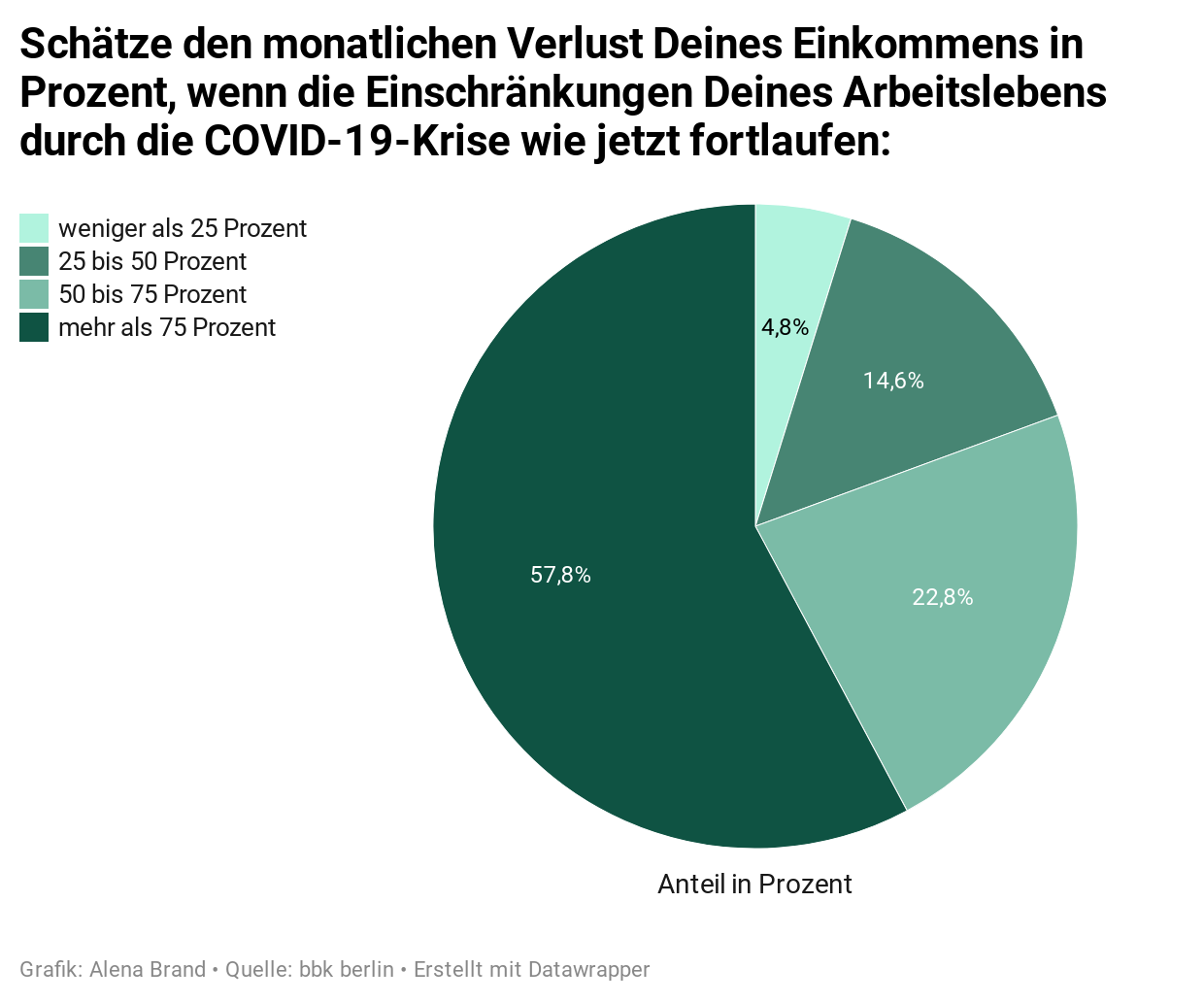 Die Einschränkungen durch die Corona-Pandemie gehen dabei selbstverständlich nicht spurlos an der Branche vorbei. „Immer wieder hört man von Kulturbetrieben und Dienstleistern in der Kulturbranche, dass es bei ihnen aufgrund der anhaltenden Pandemie zunehmend um das Überleben geht“, berichtet Ulf Hilger aus dem Fachbereich Kultur und Wissenschaft der Stadt Braunschweig. Dies bestätigt auch eine Umfrage des Berufsverbands Bildender KünstlerInnen Berlin vom März 2020. Rund 1.600 KünstlerInnen aus Berlin haben dabei den monatlichen Verlust ihres Einkommens geschätzt. Ganze 57,8 Prozent der befragten Personen gingen dabei von einem Rückgang von mehr als 75 Prozent aus. Lediglich 4,8 Prozent erwarten weniger als 25 Prozent Einkommensverlust.