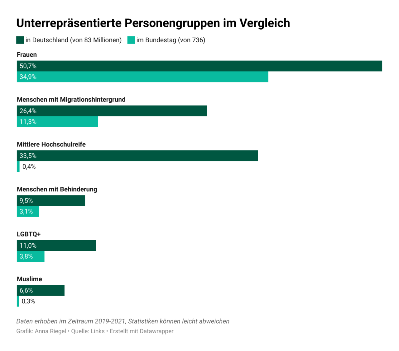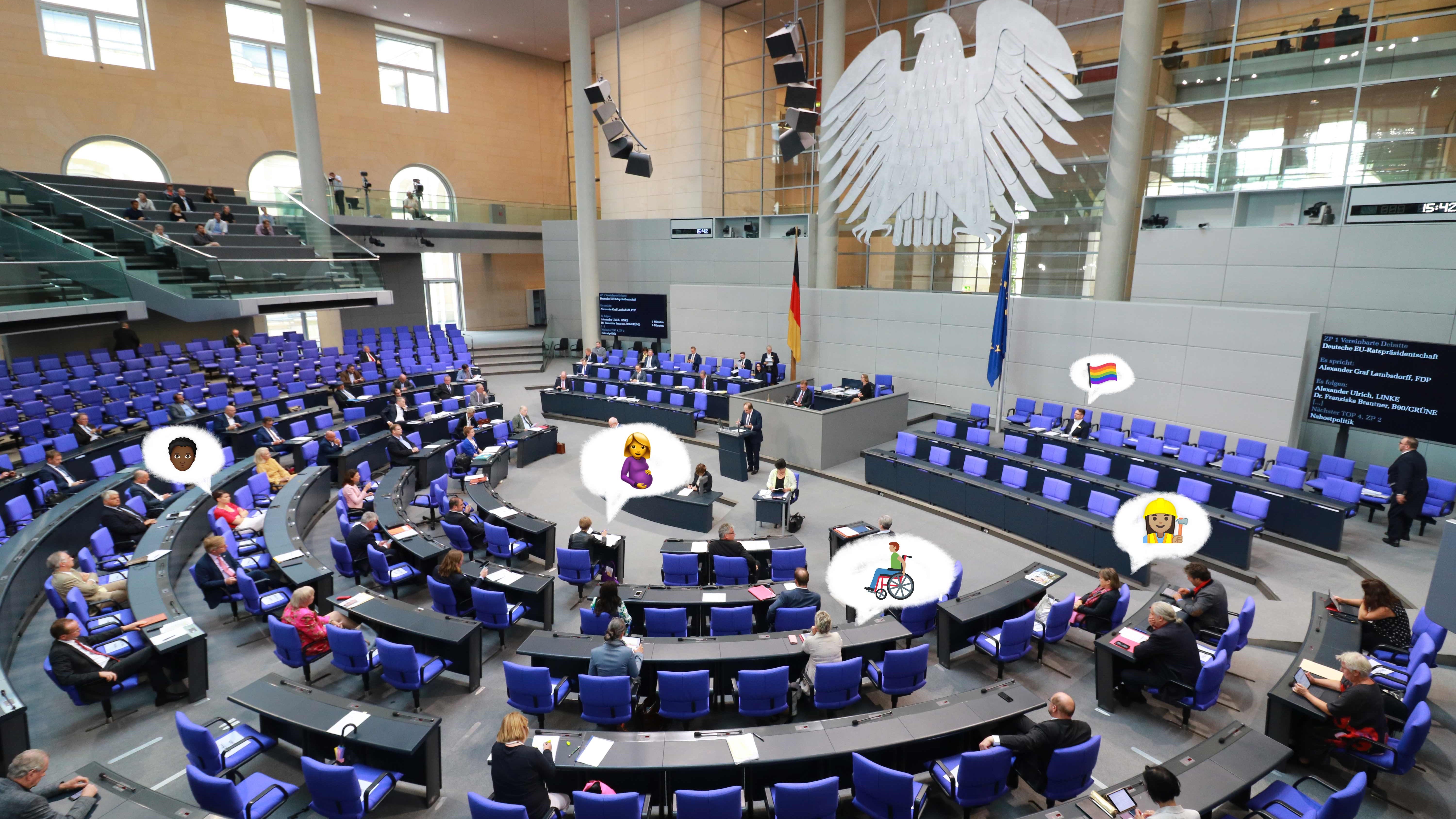 Doch nicht nur das Frausein lässt einen in der aktuellen Politik zu einer Minderheit gehören. So sind MigrantInnen im Bundestag noch immer stark unterrepräsentiert. Während in Deutschland über ein Viertel der Menschen mit Migrationshintergrund leben, stammen Recherchen des Mediendienstes zufolge nur 11,3 Prozent der Abgeordneten aus Einwandererfamilien.