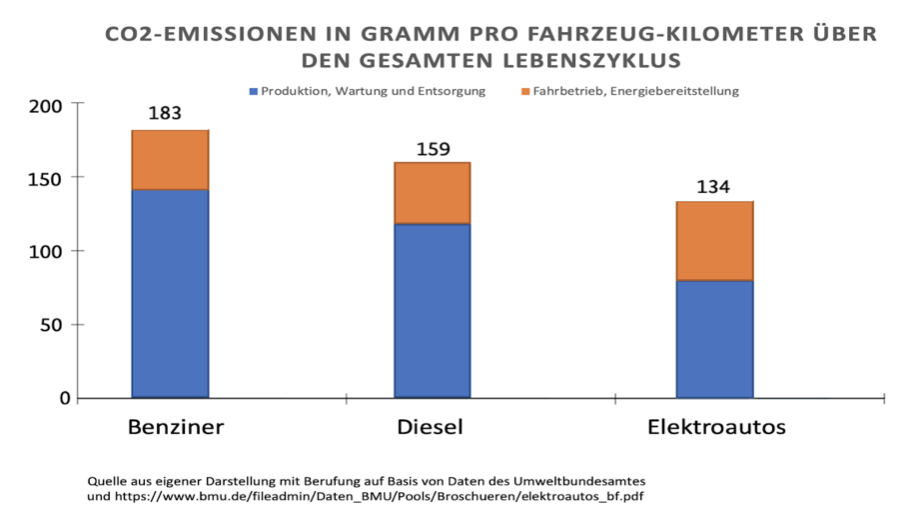 Die Analyse der CO2-Bilanz des ADAC ergibt, dass der CO2 Nachteil erst nach einer Fahrleistung von 50.000 bis 100.000 km ausgeglichen wird.