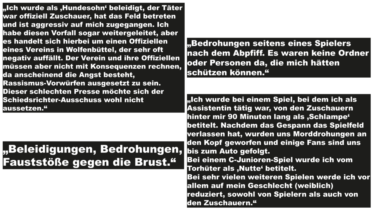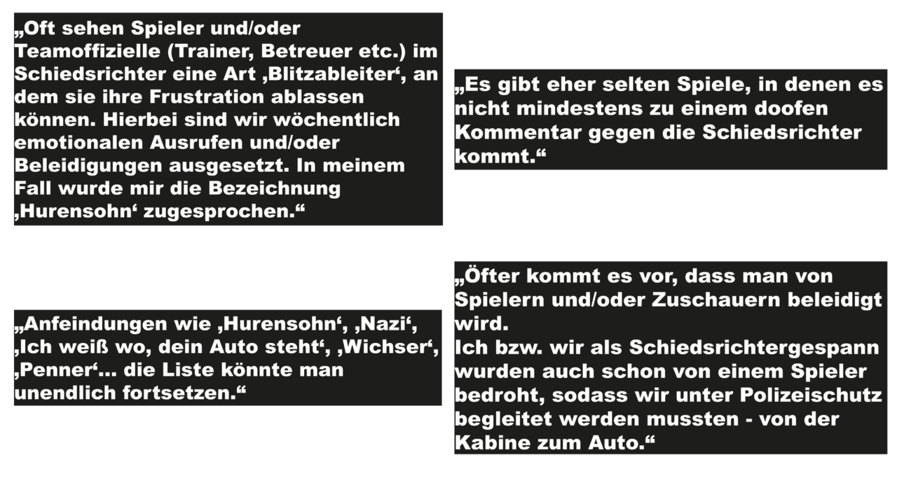 An dieser Stelle sei ausdrücklich gesagt, dass alle hier erwähnten Äußerungen subjektive Erlebnisse der an der Befragung teilnehmenden SchiedsrichterInnen sind. Aufgrund des anonymen Charakters der Umfrage konnte keine Aussage überprüft werden. Einige der Unparteiischen gaben hier auch an, bisher keine Gewalterfahrungen in ihrer Funktion gemacht zu haben.