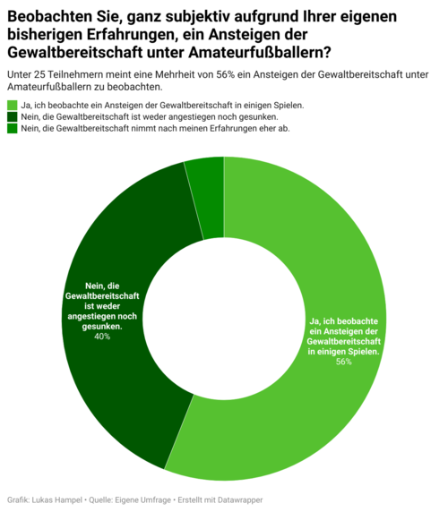 Zum Abschluss der Umfrage haben 25 teilnehmende Unparteiische die Frage beantwortet, ob sie subjektiv ein Ansteigen der Gewaltbereitschaft beobachten. Dabei bejaht eine Mehrheit diese Frage und sieht eine Zunahme. Eine zweite größere Gruppe von 40% bemerkt weder Ansteigen noch ein Sinken der Gewaltbereitschaft im Amateurbereich. Eine Minderheit von 4% nimmt sogar eher eine Abnahme der Gewalt wahr.