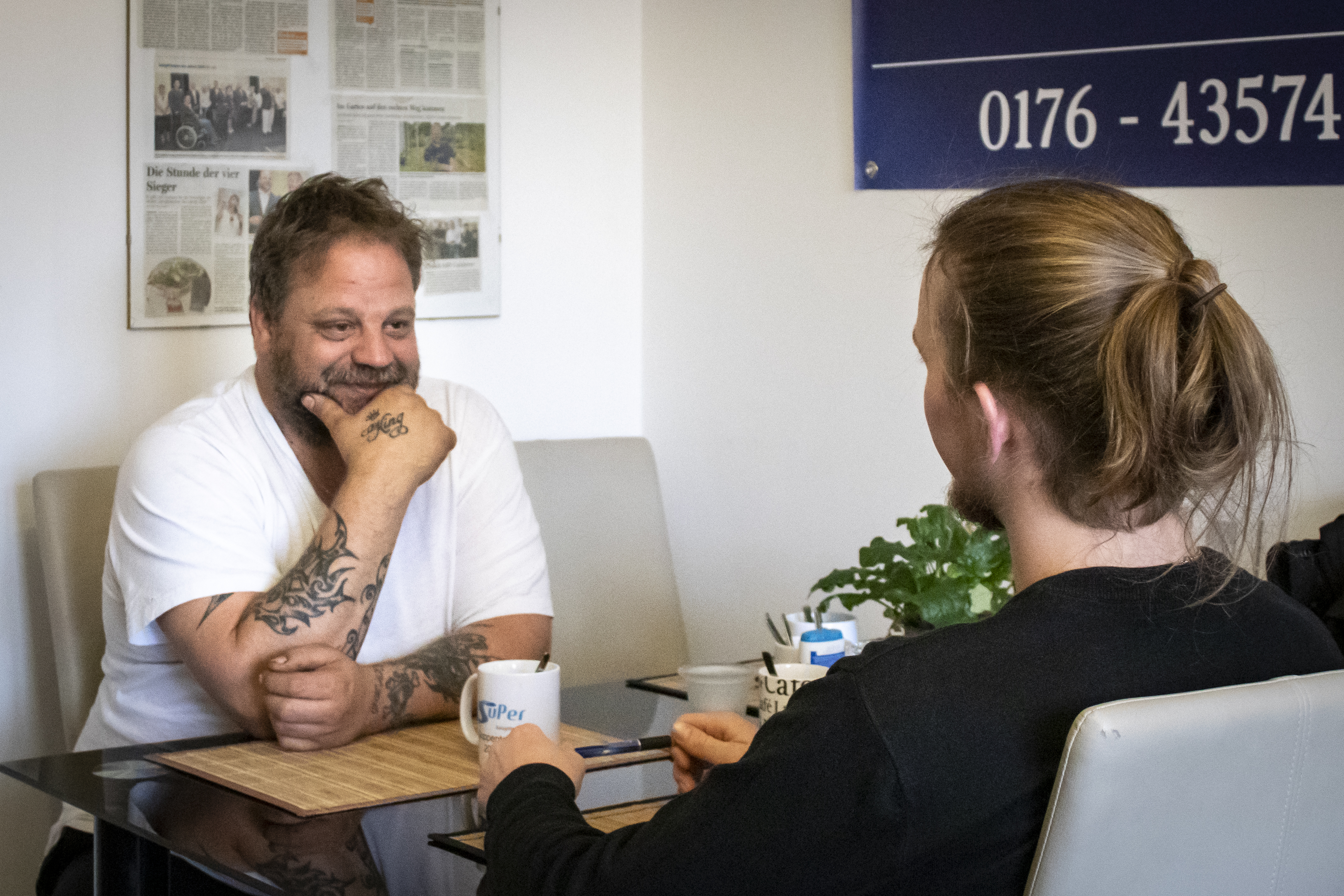 Von außen präsentiert sich der Verein sehr unscheinbar. Die Wohnung liegt am Ende einer der ellenlangen Häuserreihen, die das Stadtbild Lebenstedts prägen. Nur zwei kleine Schilder weisen auf das hin, was sich im Inneren verbirgt. Lichtdurchflutet, helle Ledercouches finden sich innen, auch ein großer Esstisch und sogar Fernseher und Balkon. In der Luft liegt Kaffeegeruch. Die Räumlichkeiten erinnern eher an ein Wohn- als ein Beratungszimmer. Es ist nicht der einzige Unterschied zu üblichen Suchtberatungsstellen. „Mir geht es nicht um Fördergelder. Mir geht es um den Menschen, der das Problem hat. Mehr interessiert mich nicht.“ Er will die Betroffenen, die zu ihm kommen, teilhaben lassen an seinem Wissen über Gefahren in der Szene, über Dealer und was es bedeutet, in Haft zu sitzen. „Suchtprävention erfolgreich realisieren.“ Kostenlos. Dafür steht der Name. Und das Projekt findet Zuspruch. Bereits in den ersten acht Tagen nach der Eröffnung kamen 32 Betroffene zu Gianluca und seinen Kollegen und baten um Hilfe. Im November waren es sogar 95. Nicht alle sind drogenabhängig. Oft sind es auch Angehörige, Eltern, besorgte Freunde. Obdachlose kommen, um frische, saubere Kleidung zu bekommen. Oder alleinerziehende Mütter, die zum Wäschewaschen vorbeikommen, weil ihre Maschine kaputt ist und es vom Jobcenter zu wenig Geld gibt, um eine neue anzuschaffen. Doch die meisten sind Suchtkranke. „Wir können uns in die Probleme hereindenken und hereinfühlen. Wir wollen mit den Leuten deutsch reden und nicht pädagogisch.“