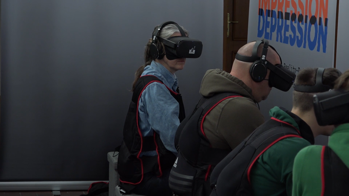 Das Ende der Depressions-Erfahrung fühlt sich befreiend an. Die mittlerweile unaushaltbar schwer gewordene Weste kann endlich abgelegt werden. Die Brille bleibt zunächst aufgesetzt. Nun sind andere Leute zu sehen, welche verteilt in Stuhlreihen vor einer Leinwand sitzen. Das Geschehen spielt sich zwar immer noch virtuell ab, aber es fühlt sich gut an, Licht, eine Handvoll Menschen und knallige Farbe zu sehen. Auf der Leinwand beginnt eine Bilder-Präsentation von glücklichen Familien und Landschaften. So erscheint unter anderem ein sorgenfrei durchs Feld laufendes Kind.